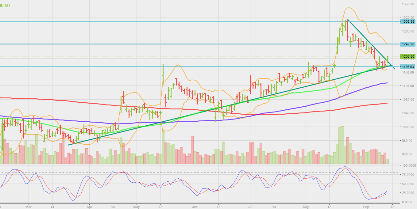 BXB has been trading in a solid uptrend since the lows in February. They recently rallied hard on the back of a solid report which has since been met with profit taking. BXB returned to the underlying uptrend line and 50 day MA, and bounced higher. Today shows BXB breaking a broad pennant pattern with the next key level of resistance at roughly $12.45. The short term stochastic are oversold, pointing up, an coming out over the oversold area.