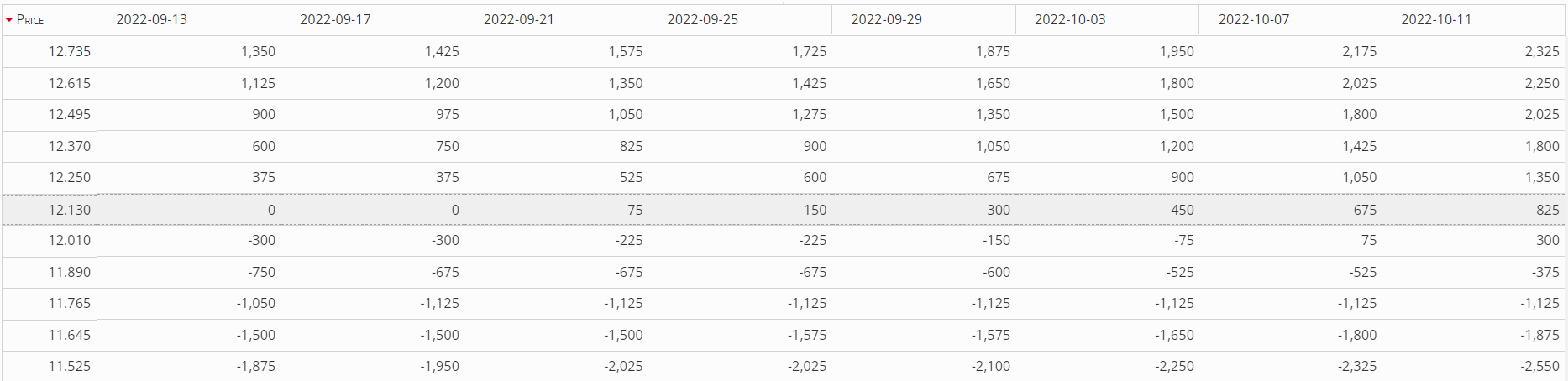 The payoff matrix below shows that we can take comfy profits with a move to the next key resistance at roughly $12.45, making about $1,000 to $1,500 (20-30%) depending on how long it takes to get up there. Otherwise, if the share price falls we could use the recent support at roughly $11.45 and stop out for a similar amount.